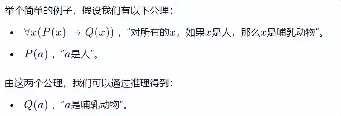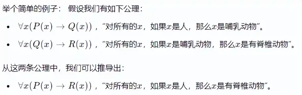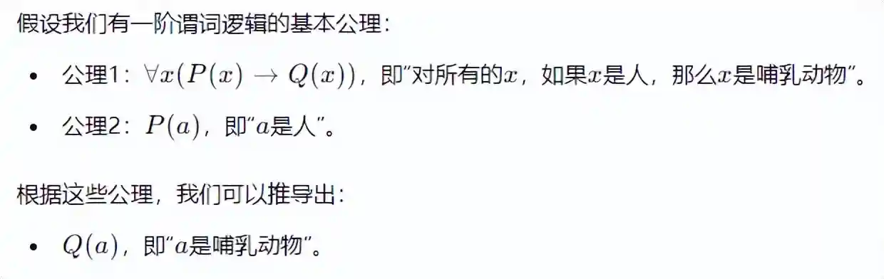 这是因为我们已经知道“a是人”以及“所有的人都是哺乳动物”,所以我们可以推导出“a是哺乳动物”。这个推导过程在系统内是可以通过形式化的规则(如合取规则、推导规则等)得出的。这表明系统中的真命题能够通过有效的推理过程被证明,进而满足完备性。
