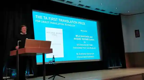 2018年3月,雅克·泰斯塔德在大英图书馆领取了首届翻译协会首次翻译奖,获奖作品是阿列克谢耶维奇的《二手时间》(图片来自出版方社交媒体)