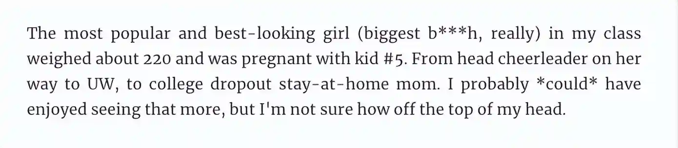 “我们高中时最受欢迎,长得最好看,同时也超级刻薄的校花,再次出现在同学会上时,体重接近200斤,正在怀着她第五个孩子。
