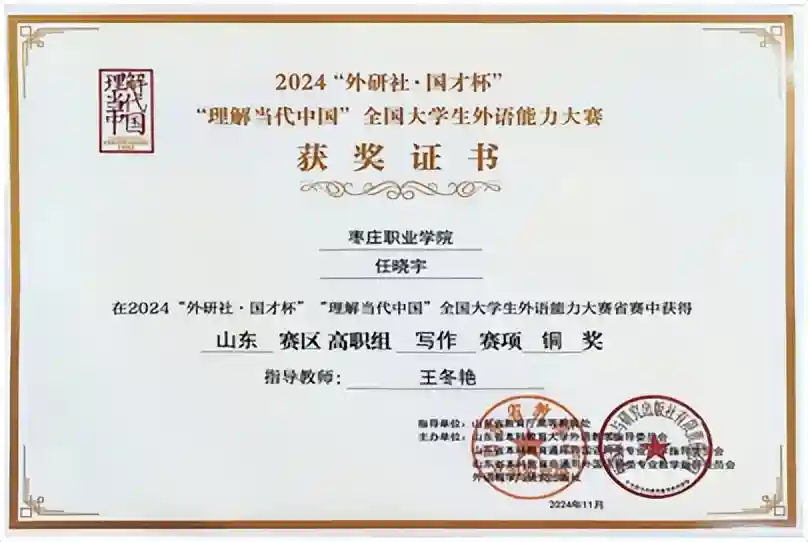 近日,2024“外研社·国才杯”“理解当代中国”全国大学生外语能力大赛山东省省赛高职组落下帷幕,枣庄职业学院学子荣获写作比赛铜奖2项、演讲比赛铜奖2项。