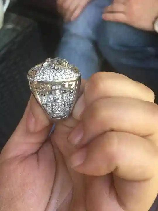 二楼的天地全部属于根纳季?乌沙科夫,他兴奋地带着我们参观各种冰球设备、奖杯等。不过最引人注目的却还是他手上的那枚戒指。根纳季见记者一直盯着这枚戒指看,很大方的从手指上取下来:“这枚戒指是上赛季NHL的冠军戒指,你可以看看,正面写上了斯坦利杯,侧面则是一面写着2017年,另外一面写着我的姓乌沙科夫。这样的戒指我有两枚,一枚就是这个,是2017年的,还有一枚是2016年的,都是匹兹堡企鹅队夺冠之后我获得的总冠军戒指,非常的珍贵。”