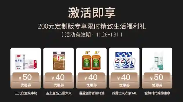 包括200多元的生活礼包、1分钱购物和奶米纸油零食等40元优惠券。