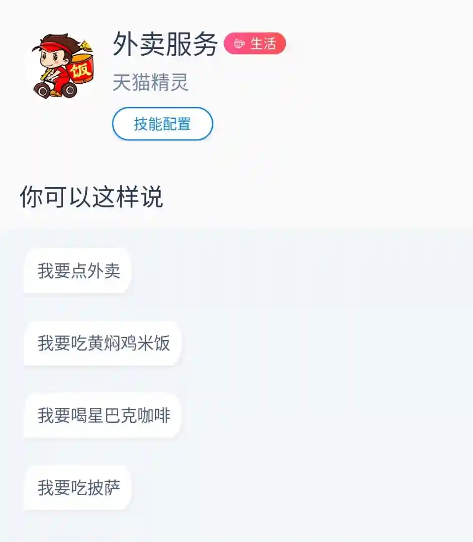 除此之外,天猫精灵还能点外卖,外卖服务由饿了么平台提供。
