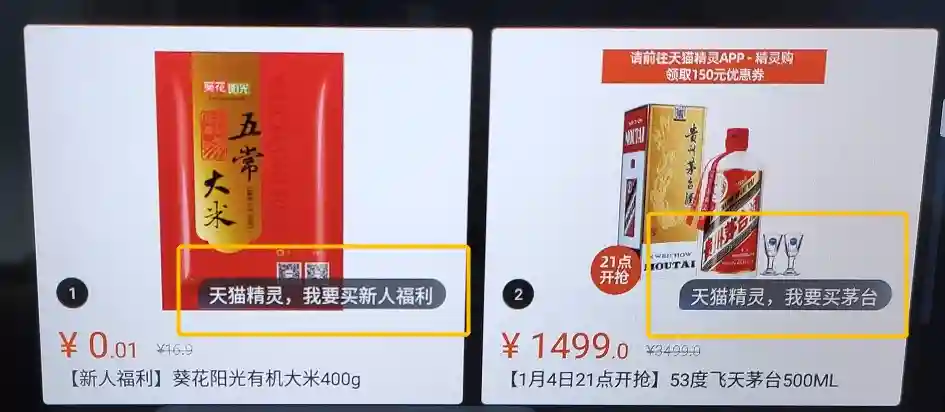 比如上图里的左边商品提示:天猫精灵,我要买新人福利。
