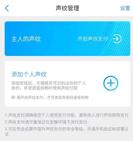 不过需要在天猫精灵App进行声纹录入,开启声纹支付功能,保证账户安全。