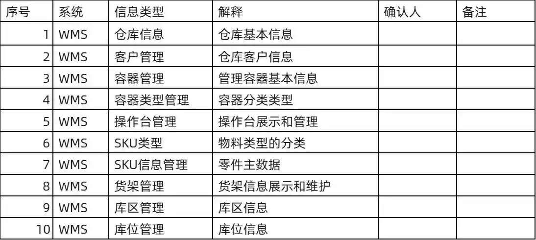 以某仓库管理系统(WMS)项目的数据收集表为例: