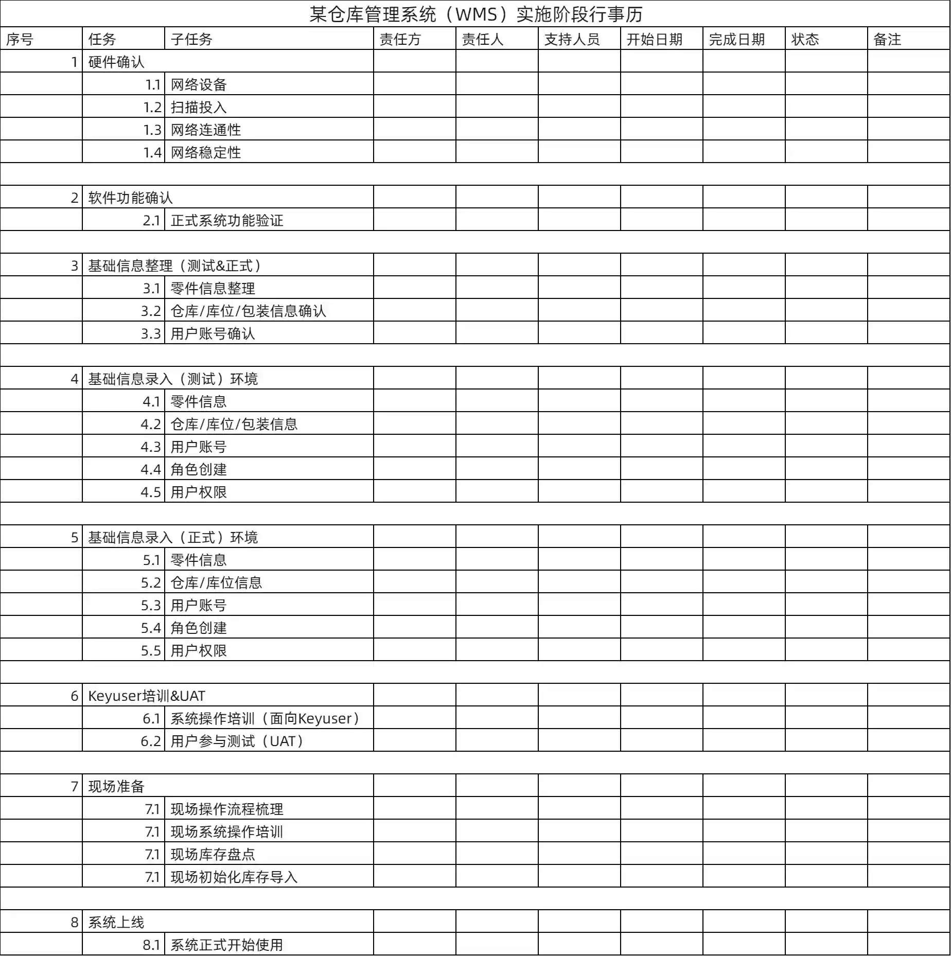 STEP2:根据提取到的与实施相关的关键任务,进一步细化子任务,写明责任方、责任人、支持人员(系统人员)、开始日期完成日期、状态、备注。