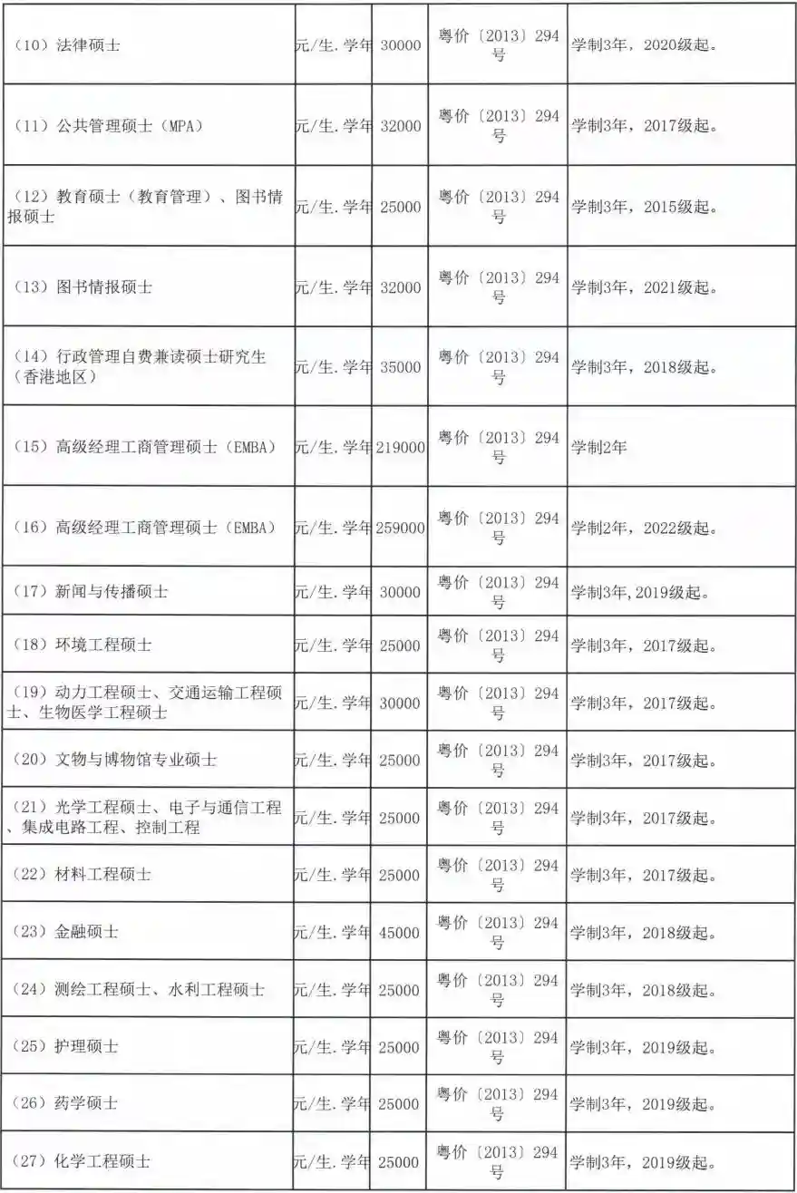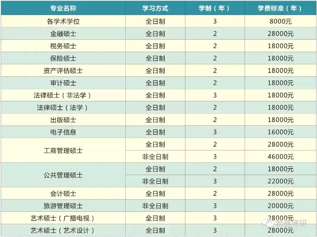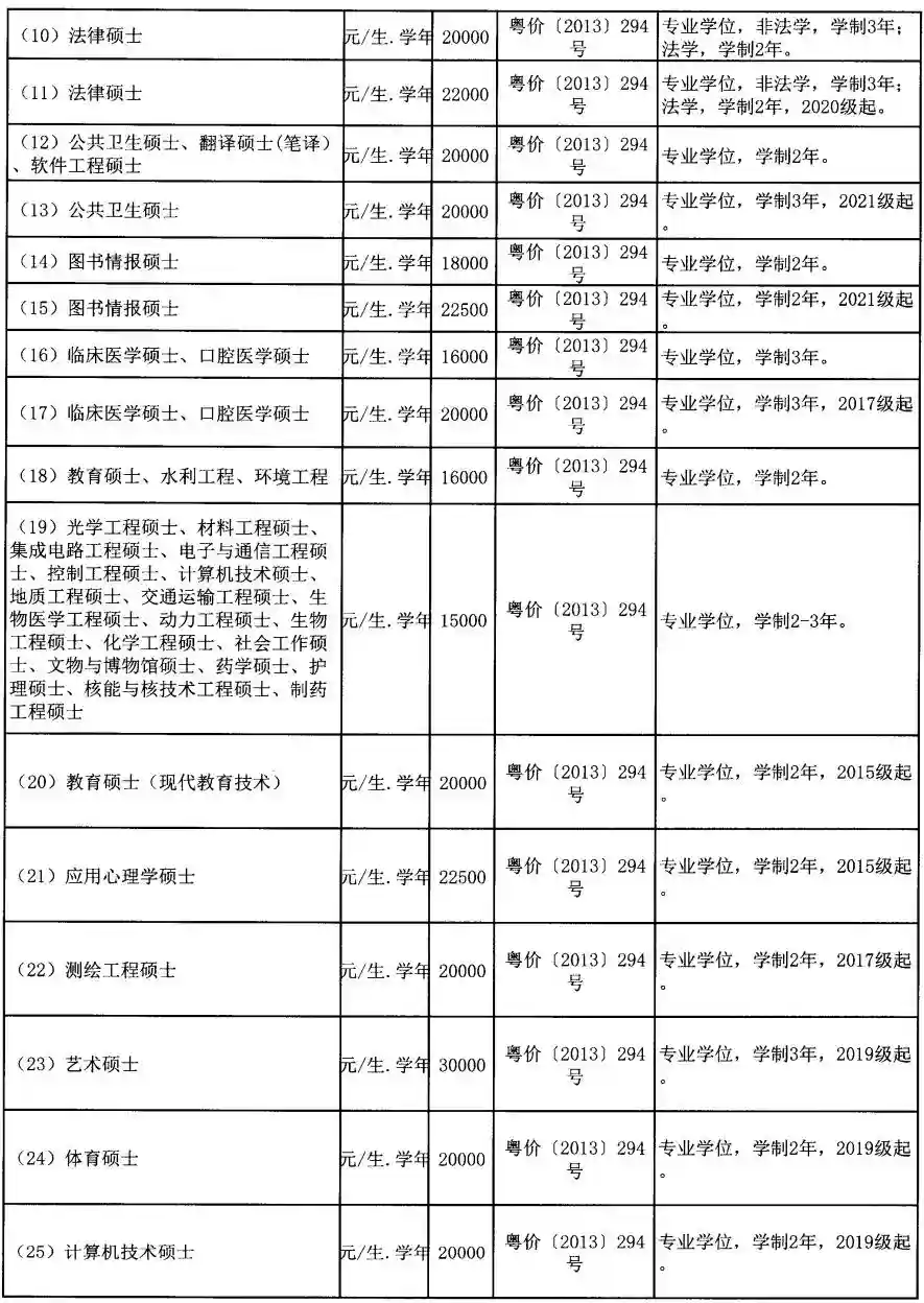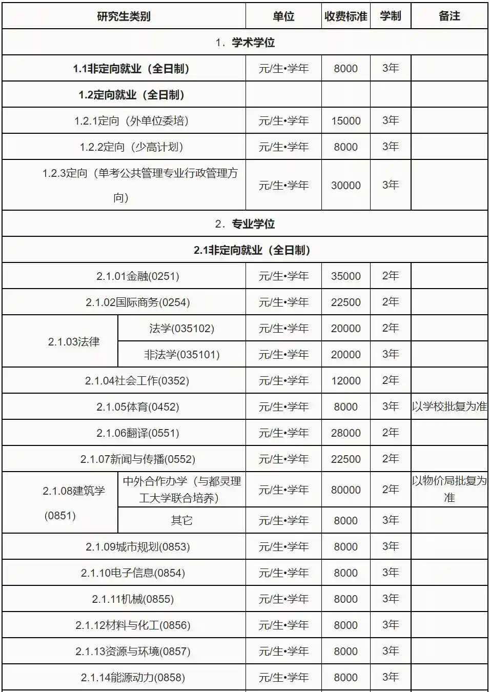 全日制硕士研究生学费收费标准(收费标准以每年上级主管部门审批公布的为准)见下表: