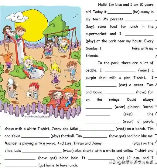 简介今天分享一篇阅读理解。可以学完一般现在时或现在进行时后进行同步阅读,也可以作为日常的阅读材料。每日10分钟英语阅读,养成习惯,孩子的英语学习不用愁。这篇文章的题目是:Adayinthepark文章中有一些空格,要求用所给动词的一般现在时或现在进行时填空。了解一般现在时的用法,可以阅读这篇文章英语语法...