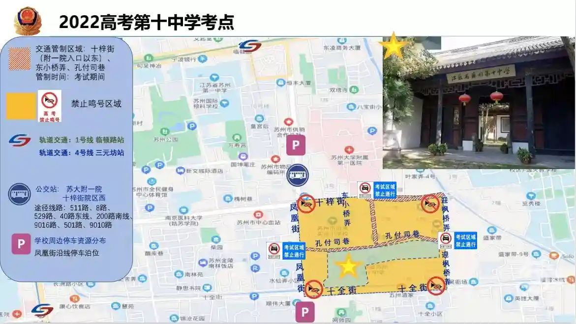 第十中学考点是一个T字型路口,为了保证考试环境没有噪音,姑苏公安分局民警对考点的十梓街(附一院入口以东)、东小桥弄、孔府司巷(凤凰街至迎风桥弄)路段实行交通管制。
