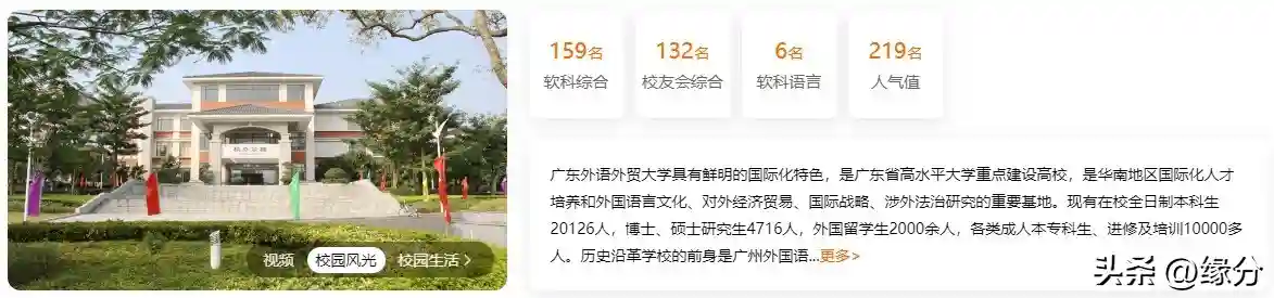 简介我们将从以下几方面大家比较感兴趣的做详细介绍:学校简介及排名、录取分数线、学费标准、资料多从学校官网及相关资料搜集所写,希望对大家有一定的帮助,仅供参考及介绍。一、学校简介及排名广东外语外贸大学具有鲜明的国际化特色,是广东省高水平大学重点建设高校,是华南地区国际化人才培养和外国语言文化、对外经济贸易...