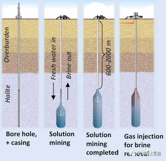 氢气的长时间储存需要依赖一定的储存空间,利用地下空间进行储氢成为了氢气储存的重要方式。诸多不同的地下储氢方案中,最有潜力的一种方式:在地下盐层中挖出一个“容器”来储氢。这个“容器”的制造需要首先钻到目标盐层,安装好套管(如石油钻井一样);其次注入溶液把盐层溶化,溶化后的盐水抽出来;再用这种溶解的方式在盐层中造出所需要的形状和大小的“容器”;最后充入气体把盐洞穴中的所有盐水排空。根据不同盐层结构,这上述溶解方法造出来的不同“容器”的形状。