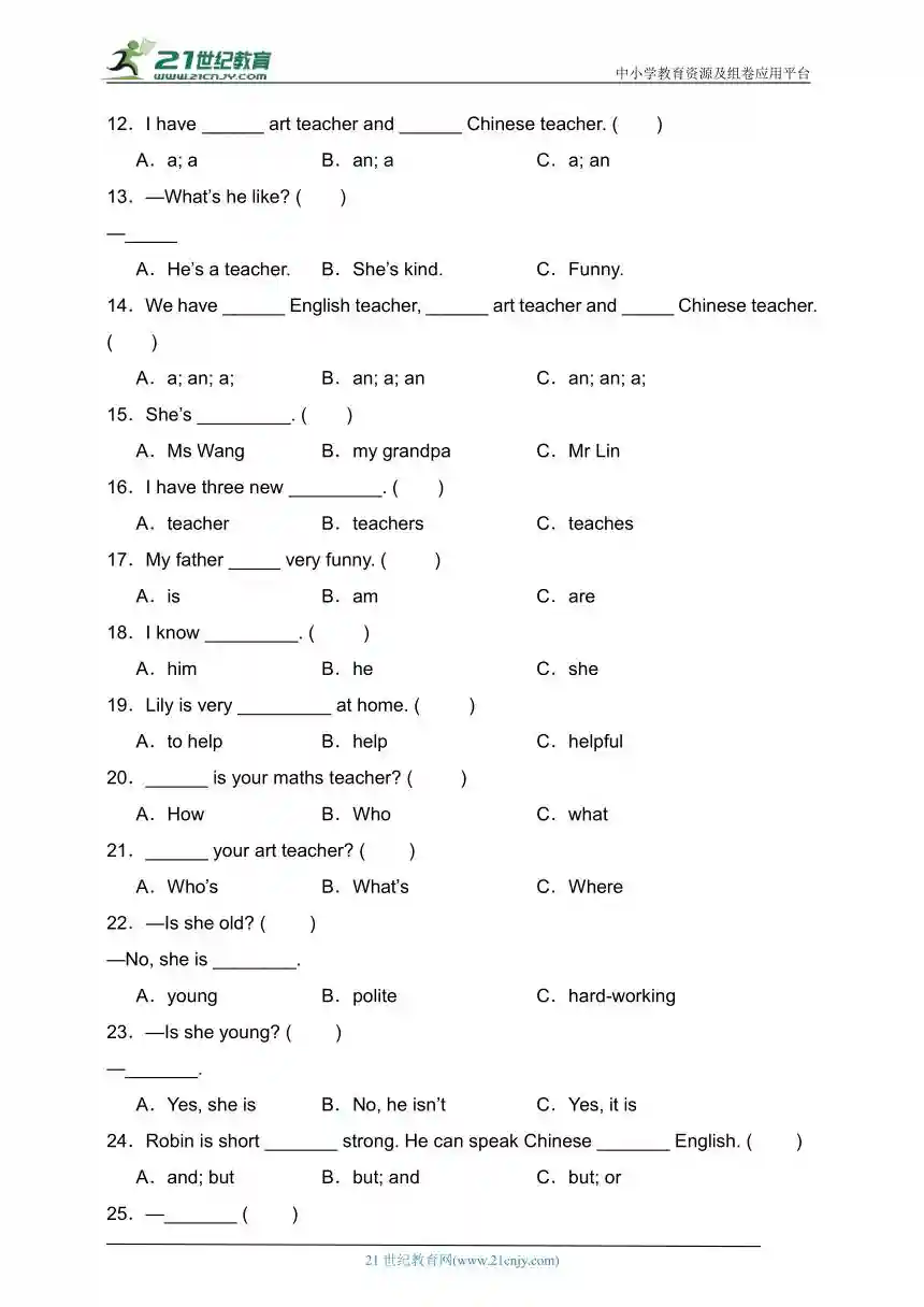 简介深化日常单词,句型的迁移应用,针对易错点配有对应的巩固练习,启发学生思维,做好课堂的的一个复习检测欢迎大家进入课件通小程序进行下载:该资料包含如下内容:Unit1What'shelike?易错题分类汇编-单选题(80题)(含答案)Unit1What'shelike易错题分类汇编-英汉...