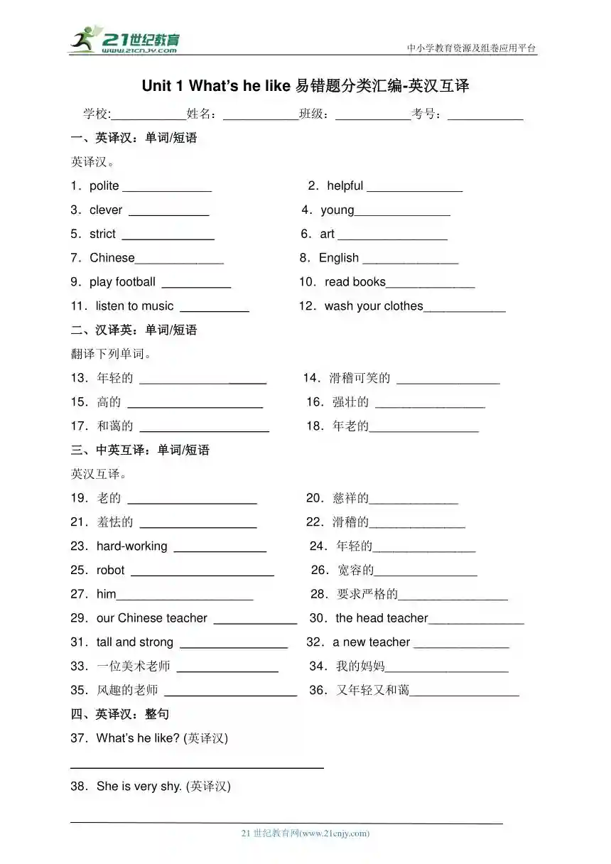 Unit1What'shelike易错题分类汇编-英汉互译(含答案)