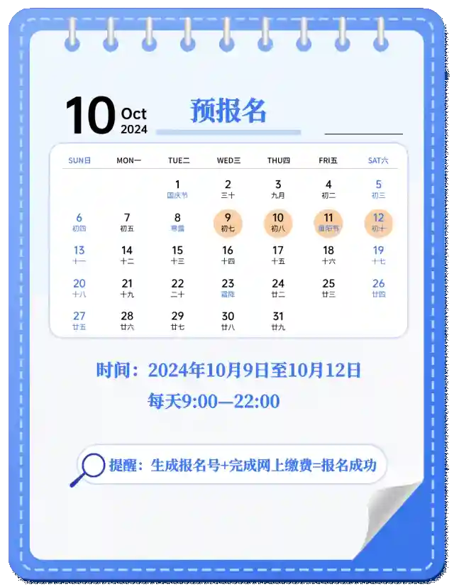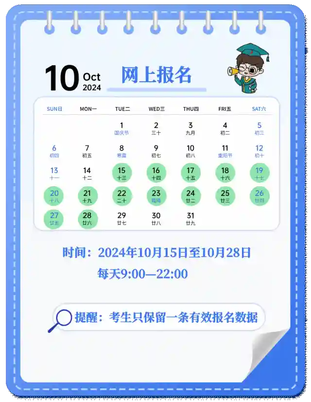 网上报名时间为2024年10月15日至10月28日(网上预报名时间为2024年10月9日至10月12日,相关工作安排由各省级教育招生考试机构确定并公布),每日9:00~22:00。请考生届时登录“中国研究生招生信息网”参加报名,查看报名须知、招生单位招生章程及省级教育招生考试机构有关报名、考试安排事项等,按要求如实填写信息并提供真实材料。