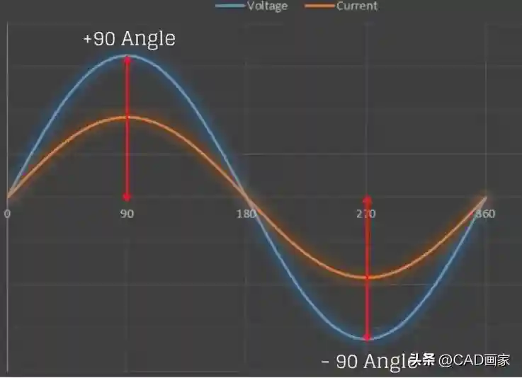 InFigurebelow,thecurrentandvoltageareinphasewitheachothermakinga+90degreeangleatthesametime,thepowerisstillpositivetheratalloftheworkdoneispositive.在下图中,电流和电压同时同相,形成+90度角,正电压乘以正电流产生正功率。当电流和电压均为负时,功率仍为正,因此在这两种情况下,功率始终为正,这称为有功功率。功率曲线将完全位于水平轴上方,并反映出所做的所有工作都是正的。