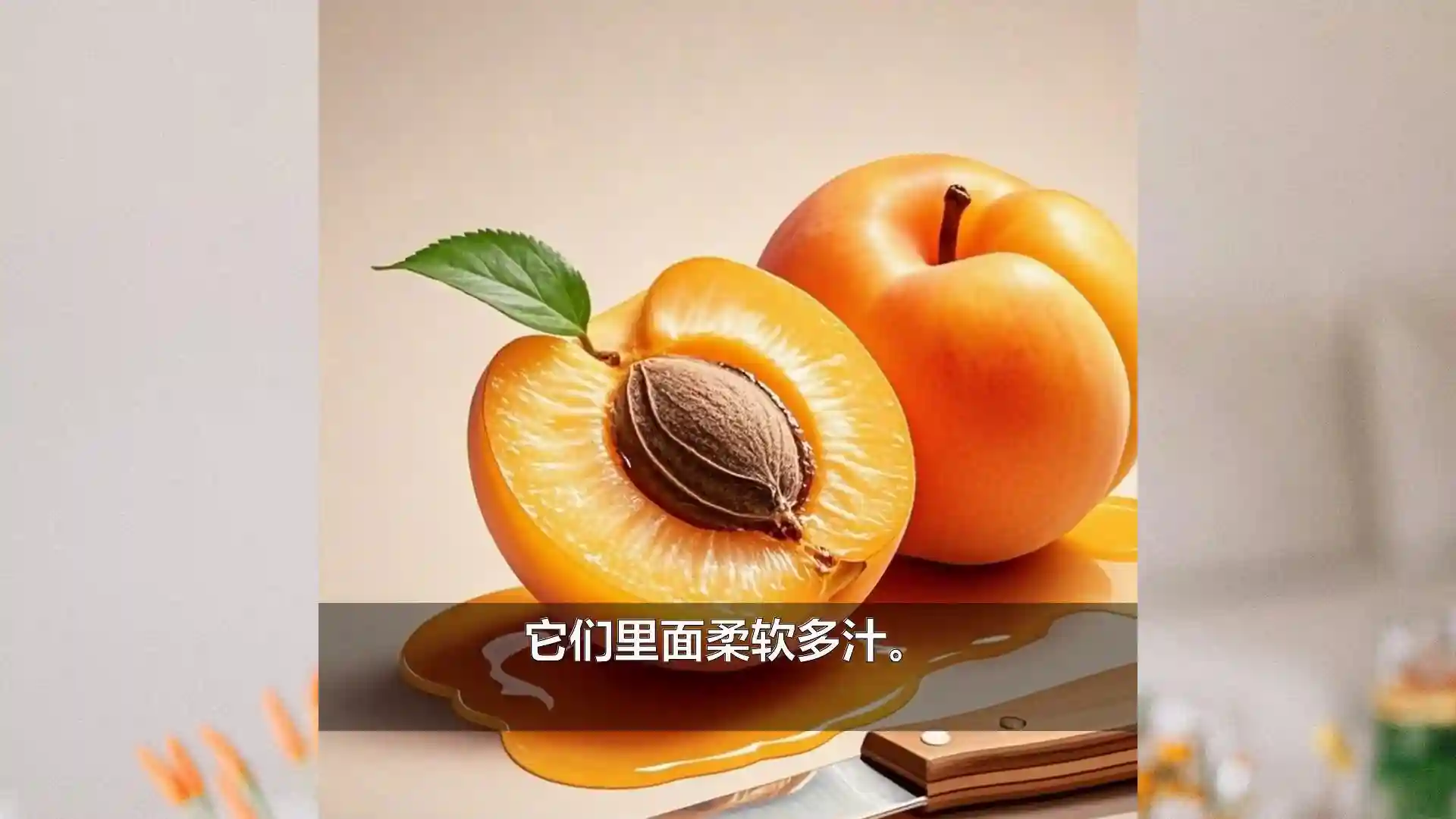 apricot-杏子,orange-yellowskin-橙黄色外皮,softandjuicy-柔软多汁,sweettaste-甜味,fruittree-果树,pickapricots-摘杏子。