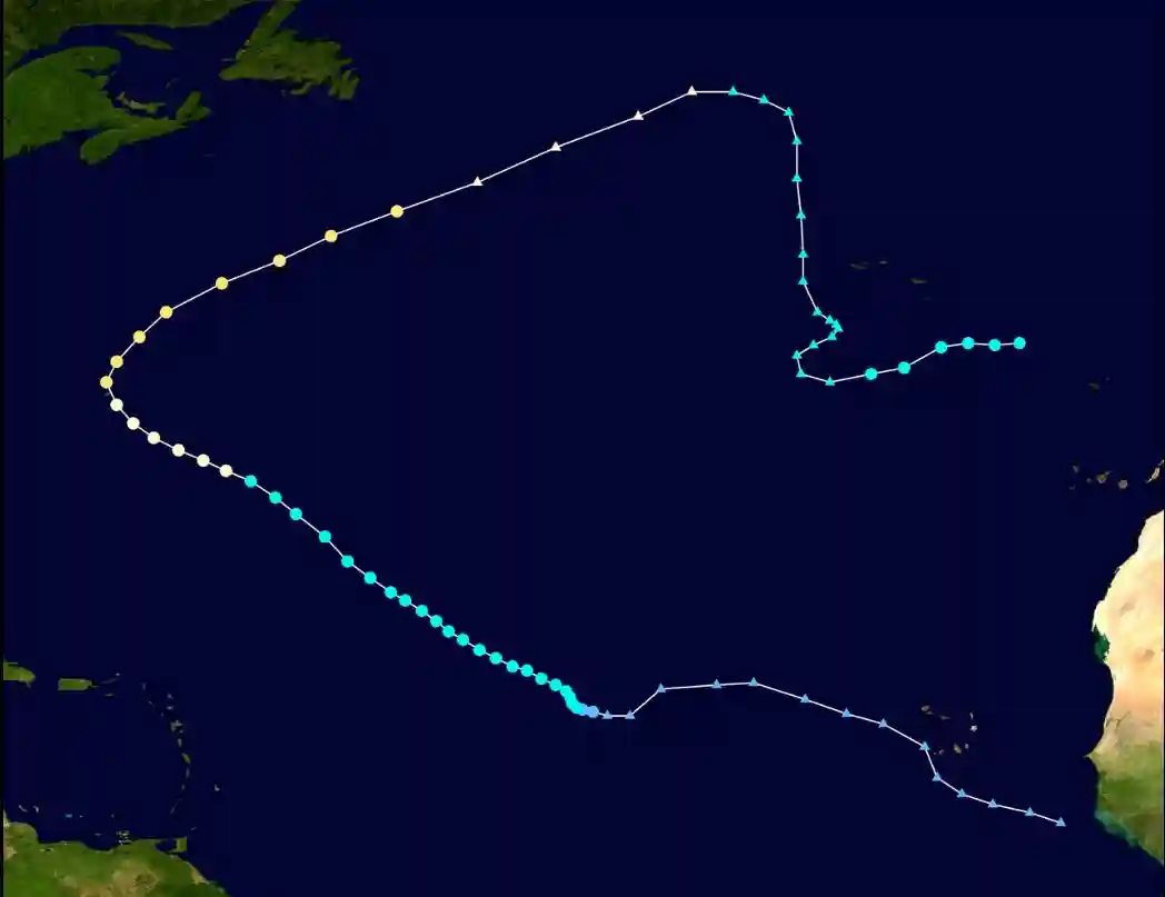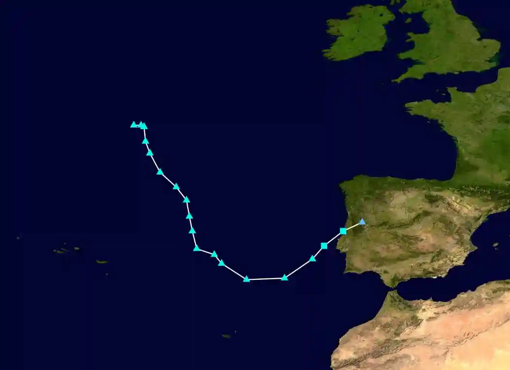 “Paulette”的路径,三角形表示温带气旋或者热带扰动