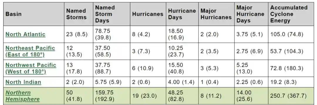 今年北大西洋活跃度显著偏高,而西北太平洋活跃度显著偏低(括号内数据都是历史平均值)