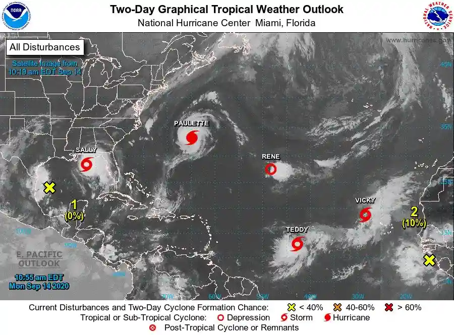 9月,是北大西洋飓风最活跃的月份。西北太平洋又“哑火”了,北大西洋却继续发力,9月1日编号14、15的风暴生成,继续刷新历史纪录;9月7日又编号两个;12日,18风暴“Sally”生成;14日,又编号两个风暴“Teddy”和“Vicky”,当天创下五个风暴同舞的超级纪录(Paulette,Rene,Sally,Teddy,Vicky),本来面积不是很大的北大西洋几乎是塞得满满当当,而且不光是成型的风暴,在墨西哥湾和西非还分别有两个热带扰动(就是飓风的胚胎)!这个纪录,即便是西北太平洋也非常罕见!这样以来,北大西洋风暴总数几乎快超过其他几个海区总和了……