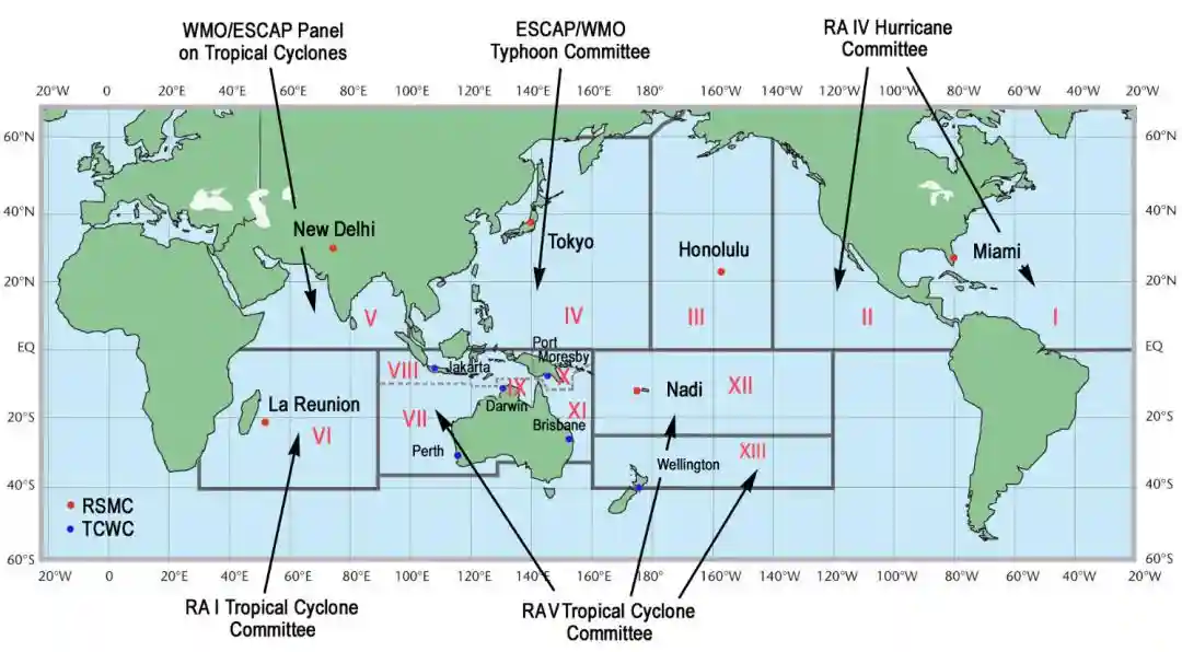 我国有台风,美国有飓风。其实,虽然叫法略有不同,但本质上两者完全一样,唯一区别在于生成的海区。北半球分为西北太平洋(W)、中北(C)/东北(E)太平洋、北大西洋(L)、北印度洋(阿拉伯海A,孟加拉湾B)几大海区,南半球分为南太平洋(P)、南印度洋(S)和南大西洋(无编号,极少见)几大海区。西北太平洋生成的热带风暴,就称为台风;中/东北太平洋和北大西洋生成的风暴,称为飓风;北印度洋生成的热带风暴称为气旋性风暴;南半球的风暴则统称为气旋,或翻译为旋风。这些区别性称呼是为了尊重不同地区的语言习惯。