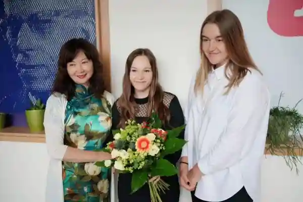 捷克首次以中文作为外语科目参加毕业考试的两位中学生:妮蔻(中)和梅露(右)。图左为她们的中文老师刘薇女士。