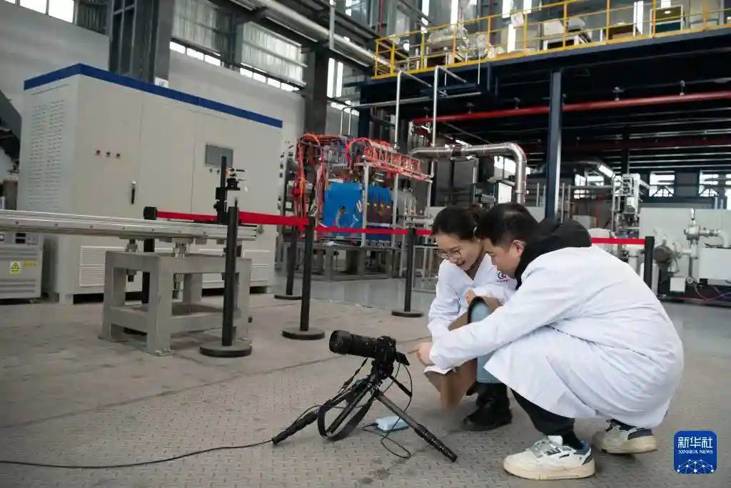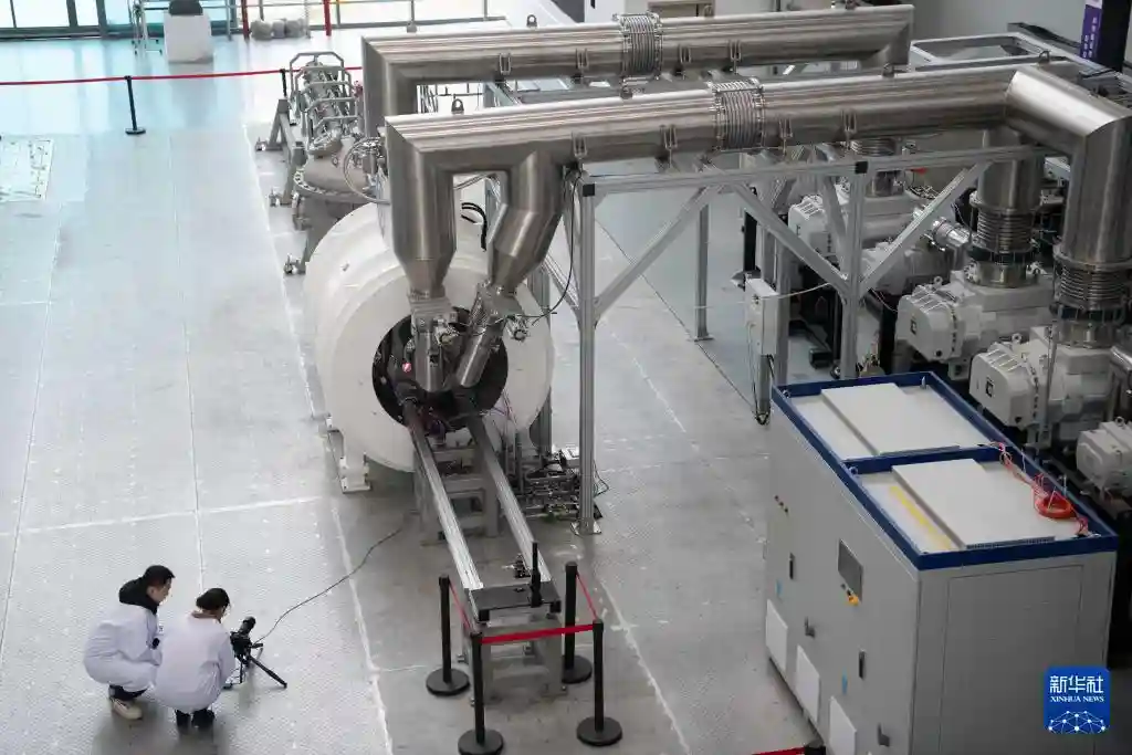 1月14日,在位于安徽省合肥市的聚变堆主机关键系统综合研究设施(CRAFT)园区内,科研人员在强流直线等离子体装置“赤霄”前进行交流。新华社记者张端摄