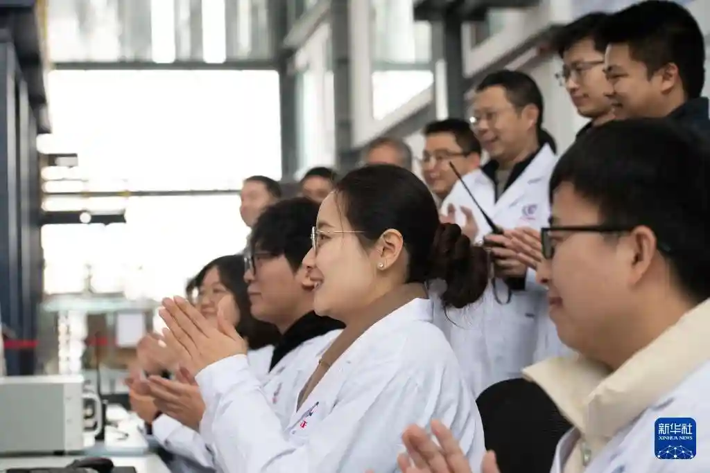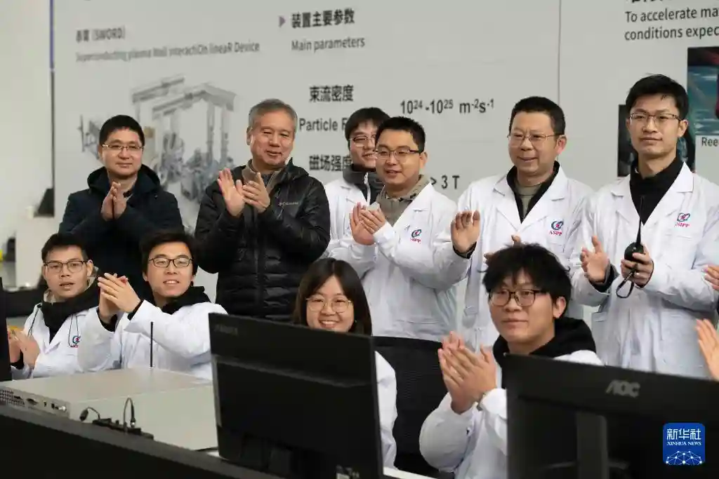 1月14日,经专家组鉴定,“赤霄”参数达到设计指标,科研人员在强流直线等离子体装置“赤霄”前庆祝。新华社记者张端摄
