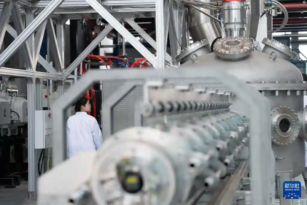 1月14日,在位于安徽省合肥市的聚变堆主机关键系统综合研究设施(CRAFT)园区内,科研人员在巡看强流直线等离子体装置“赤霄”的运行状态。新华社记者张端摄