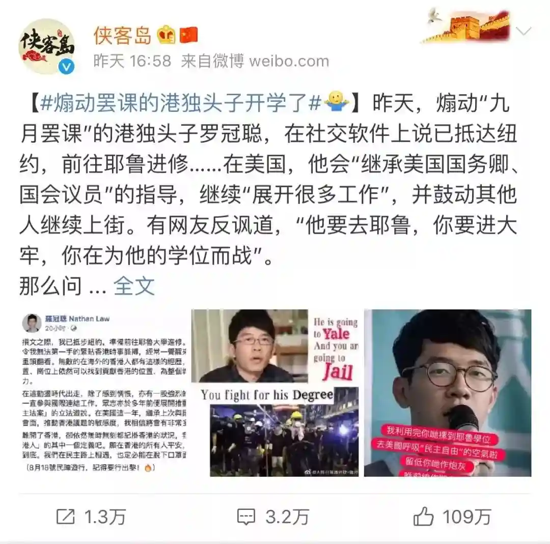 罗冠聪赴耶鲁继续学业(图源:侠客岛微博)