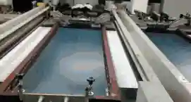 平网印花印花模具是固定在方形架上并具有镂空花纹的涤纶或锦纶筛网(花版)。花版上花纹处可以透过色浆,无花纹处则以高分子膜层封闭网眼。印花时,花版紧压织物,花版上盛色浆,用刮刀往复刮压,使色浆透过花纹到达织物表面。