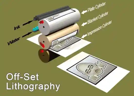平版印刷由于平版印刷上的图文部分与非图文部分处于同一个平面上,在印刷时,为了能使油墨区分印版的图案部分还是非图案部分,利用油水分离的原理,首先由印版部件的供水装置向印版的非图文部分供水,从而保护了印版的非图文部分不受油墨的浸湿。然后,由印刷部件的供墨装置向印版供墨,由于印版的非图文部分受到水的保护,因此,油墨只能供到印版的图文部分。最后是将印版上的油墨转移到乳皮上,再利用橡皮滚轮与压印滚筒之间的压力,将乳皮上的油墨转移到承印物上,完成一次印刷,所以,平版印刷是一种间接的印刷方式。