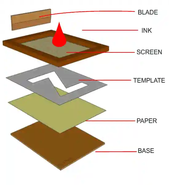 丝网印刷是将丝织物、合成纤维织物或金属丝网绷在网框上,采用手工刻漆膜或光化学制版的方法制作丝网印版。现代丝网印刷技术,则是利用感光材料通过照相制版的方法制作丝网印版(使丝网印版上图文部分的丝网孔为通孔,而非图文部分的丝网孔被堵住)。印刷时通过刮板的挤压,使油墨通过图文部分的网孔转移到承印物上,形成与原稿一样的图文。