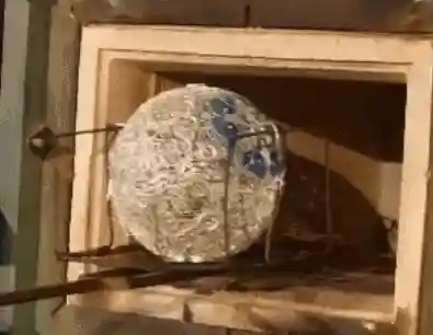 烧蓝是将整个胎体填满色釉后,再拿到炉温大约800℃的高炉中烘烧,色釉由砂粒状固体熔化为液体,待冷却后成为固着在胎体上的绚丽的色釉,此时色釉低于铜丝高度,所以得再填一次色釉,再经烧结,一般要连续四五次,直至将纹样内填到与掐丝纹相平。
