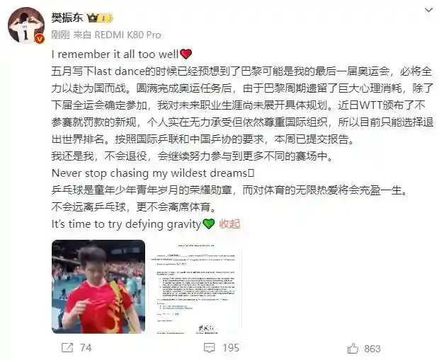 2024年12月27日,樊振东发文宣布退出世界排名。其称近期WTT最新出台的退赛罚款新规定,因身体目前还无法负荷每一次高强度赛事,出于对国际组织的尊重,已于周一签署文件,最终做出退出世界排名的选择,但不会退役。