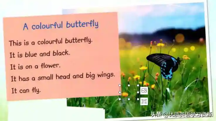 简介今天分享与动物话题相关的阅读,可以作为词汇和阅读学习的配套资源,也可以作为写作的学习资料。每日10分钟英语阅读,养成习惯,孩子的英语学习不用愁。这个话题的题目是:Acolorfulbutterfly当我们介绍昆虫时,可以从以下6个方面来介绍:思维导图为作者原创,如使用或转载,请注明出处来读范文:1....
