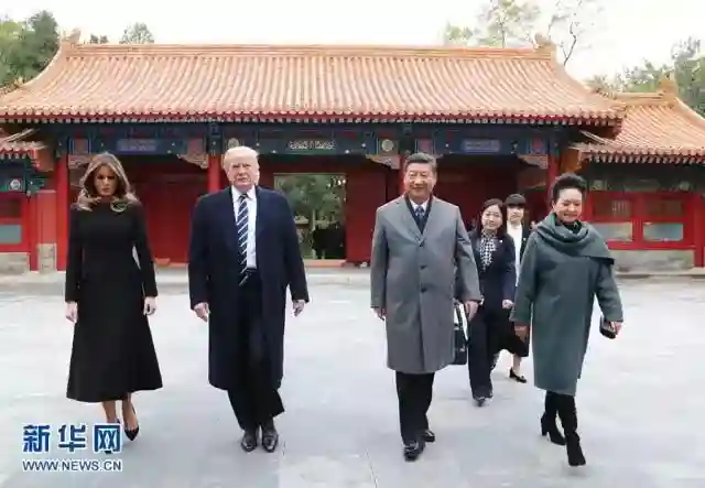 据新华社电11月8日,国家主席习近平和夫人彭丽媛陪同来华进行国事访问的美国总统特朗普和夫人梅拉尼娅参观故宫博物院。两国元首夫妇在故宫宝蕴楼茶叙,共同参观故宫前三殿,观看文物修复技艺展示和珍品文物展,并欣赏京剧表演。
