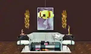 橙色和红色活泼奔放,黄色和蓝色优雅宁静,这样的颜色搭配或许会碰撞出意想不到的视觉美。颜色的精彩碰撞带来了惊艳的视觉体验,给人留下深刻的印象。几个鲜艳并且跨度大的颜色,大胆地以撞色的手法去表现突出该种风格,更多的是希望表现出大气感和时尚感。选择的产品包括休闲椅、茶几、边几、落地灯、挂画和摆件。墙面大面积留白是希望与前面摆放密集的产品发生碰撞,让人的视觉能够聚焦在画面中心,留白让整个画面更透气、更轻盈,符合“就简”这一主旨。
