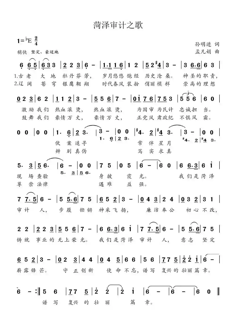 二、审计之歌的词作者是东明县审计的干部孙明进,曲作者是曲孟凡娟是菏泽学院音乐与舞蹈学院音乐表演系主任孟凡娟。