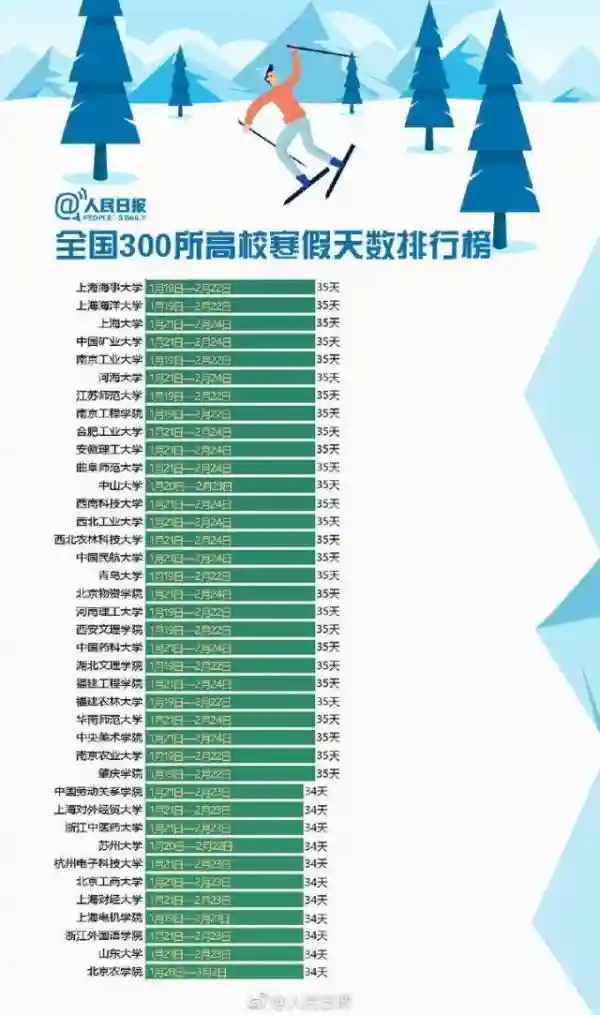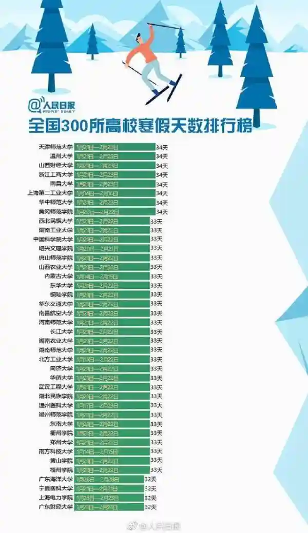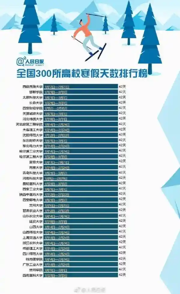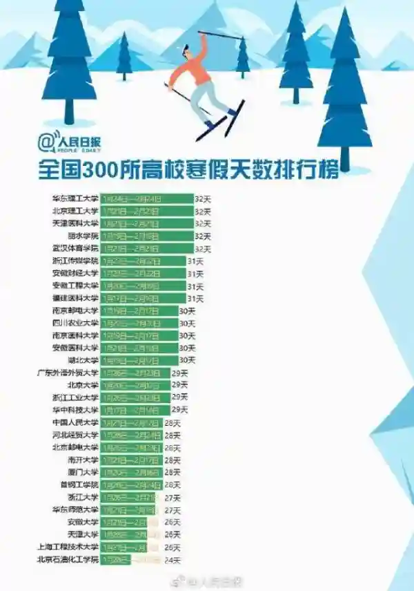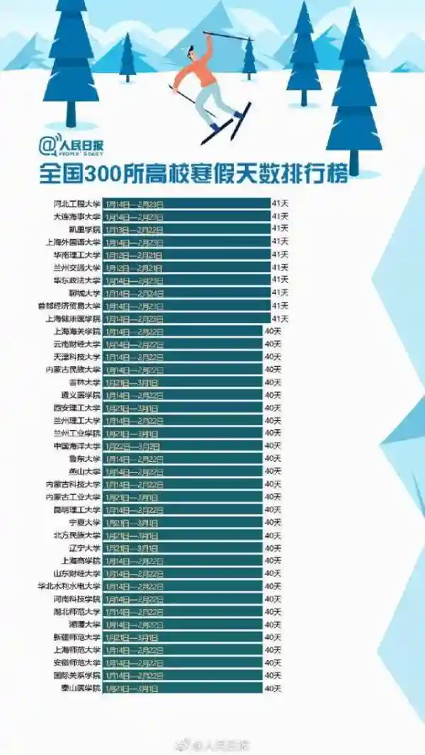 快来围观!全国300所高校寒假天数排行榜!