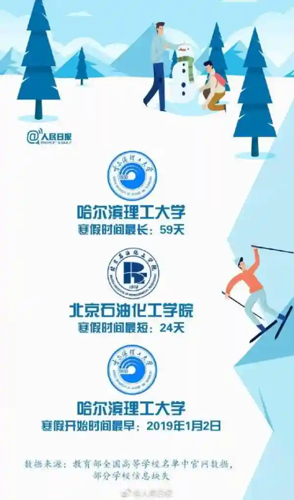 2019年寒假,哈尔滨理工大学以59天雄踞榜首,比排名垫底的北京石油化工学院24天整整多出了一个中山大学的假期!