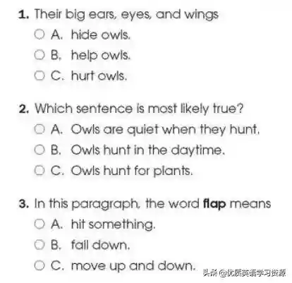 简介今天分享一篇阅读理解。该文章可以在学习动物的话题时进行配套阅读,也可以作为日常的阅读练习材料。每日10分钟英语阅读,养成习惯,孩子的英语学习不用愁。这篇文章的题目是:AboutOwls先来读文章:1.Didyouknowthatowlshaveears?你知道猫头鹰有耳朵吗?owlshaveears...