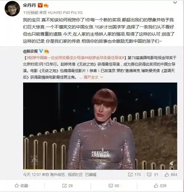 出生于北京的80后赵婷,凭《无依之地》拿下2项金球大奖,宋丹丹:你是我们家的传奇