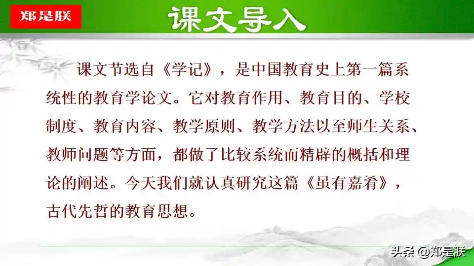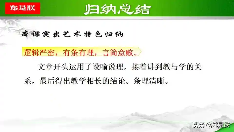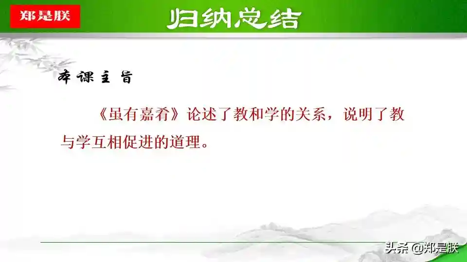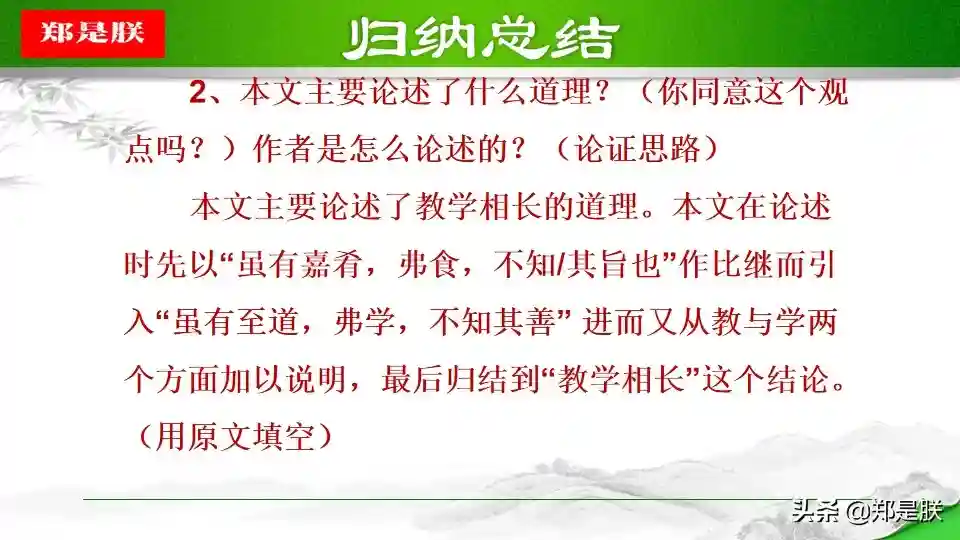 简介1.本文的中心思想是什么?文章运用“类比手法”引出要阐述的观点,讲述了“教学相长”的道理。即教人和学习是相互促进,相辅相成的。告诉我们实践出真知的道理。2.本文主要论述了什么道理?答:讲述了教学相长的道理。-教和学是相互促进的,二者相辅相成。人学习之后就会知道不足,知道了不足之处,才能反省自己,提高...