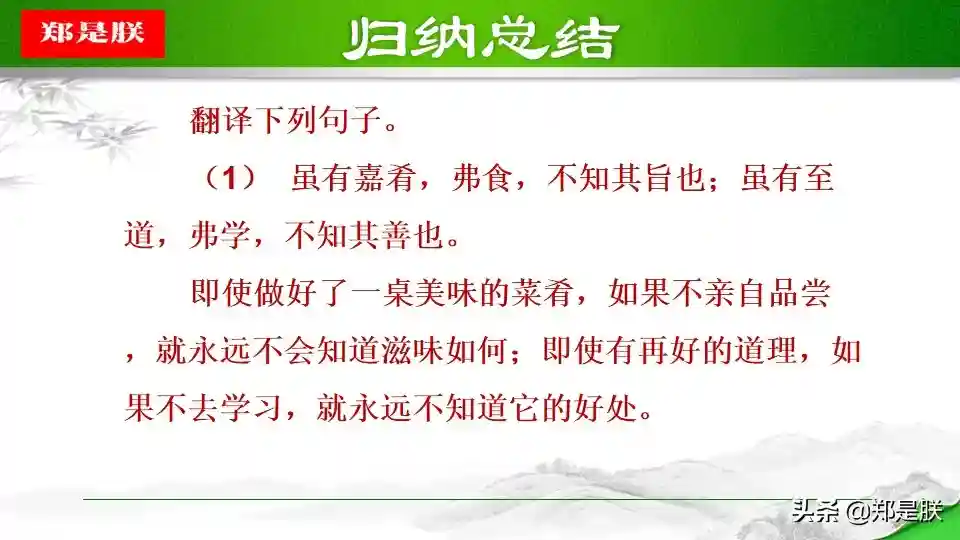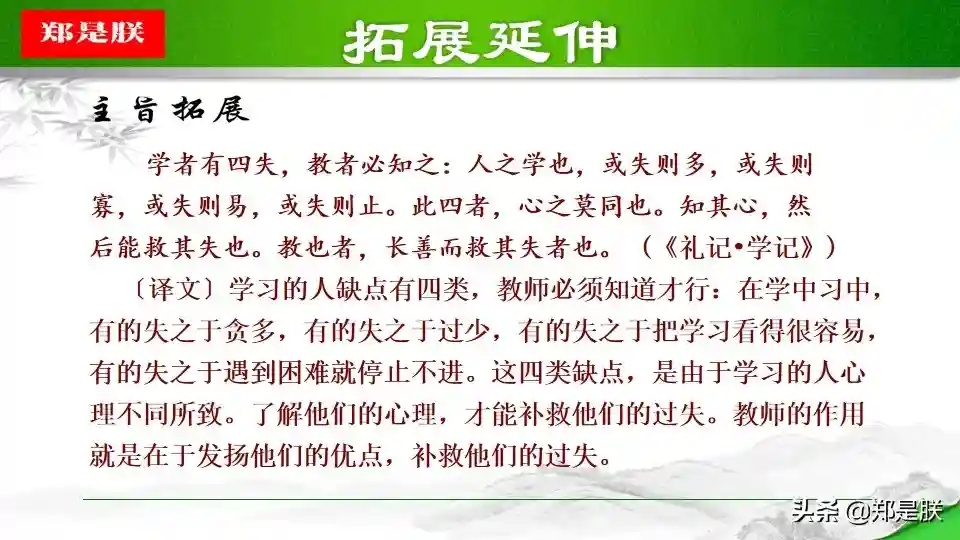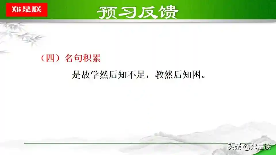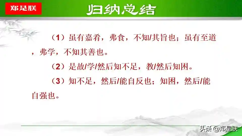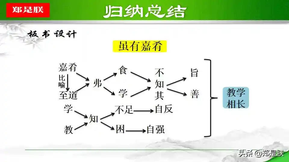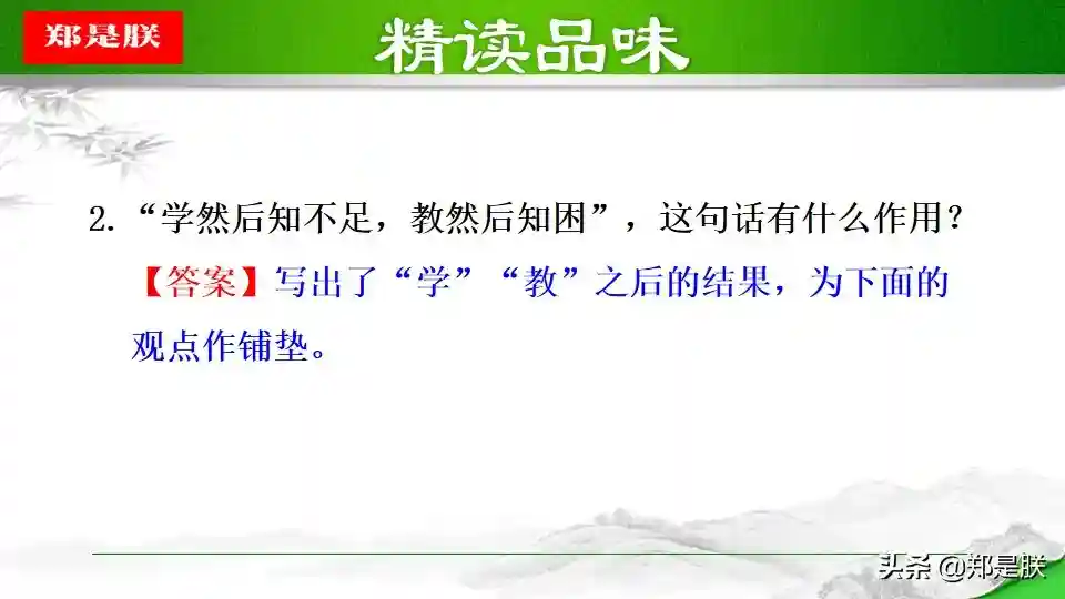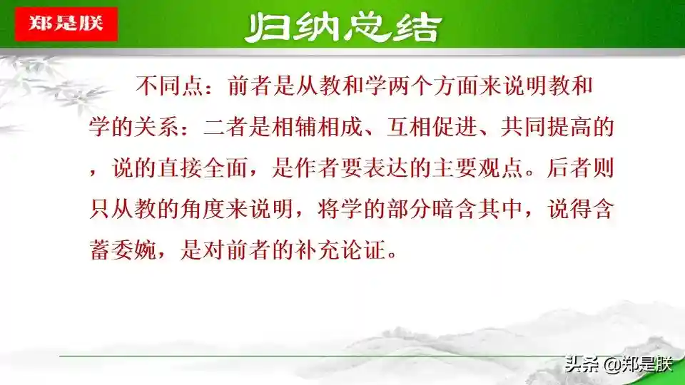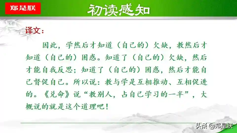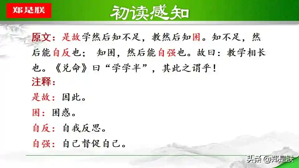 ②一方面,学是第一位的,不学,则无法获得知识,也无法知道自己的不足,也就没有完善自己的机会。人学习之后就会知道不足,知道了不足之处,才能反省自己,提高自己。另一方面,“教学相长”还意味着学习中的互动和交流。有时候,可以采用教的方式学习。比如尝试把自己的理解讲给同桌听,看看他的反应。如果他能明白,可能表明你确实理解透彻了;如果他仍有疑惑,可能表明你的理解中存在漏洞或缺陷,这时就可以“知困”而“自强”。