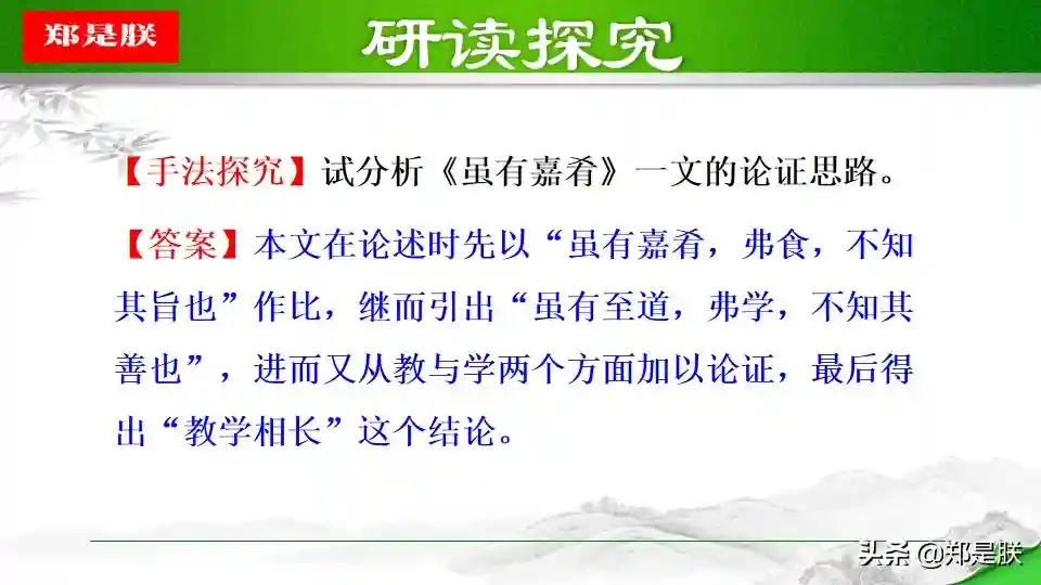 ①运用类比,引出论点,层层递进论证论点。开篇举出嘉肴不食而不知其味,引出至道不学不知其善,进而强调实践的重要性,层层推进,最终引出本文的中心论点——教学相长。使得论证严谨、有条理。