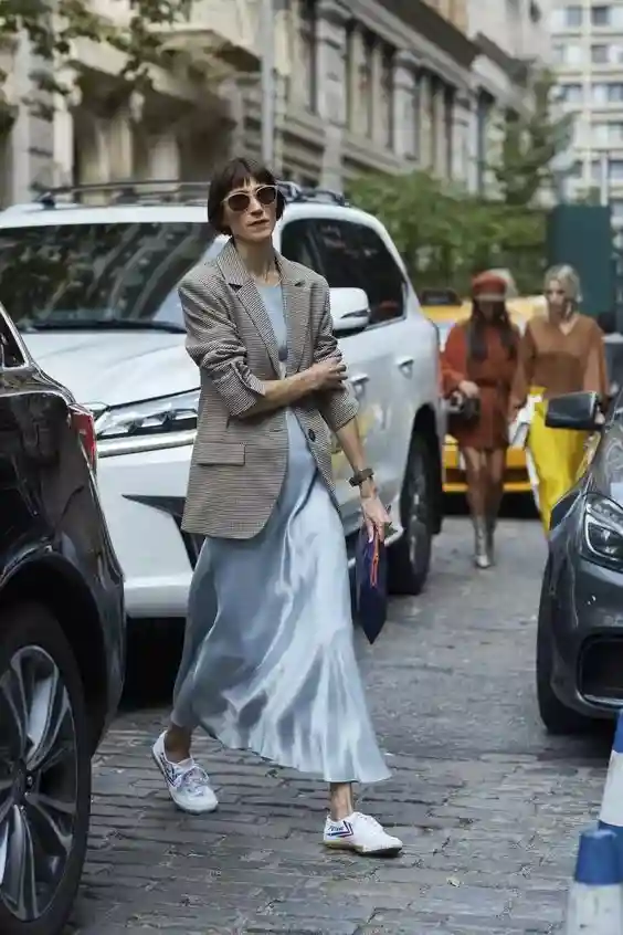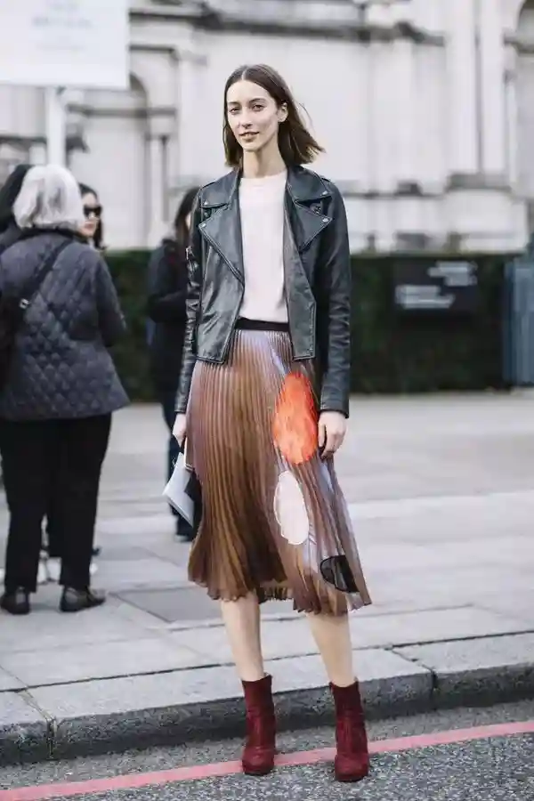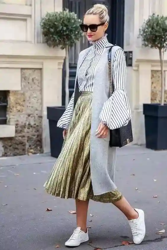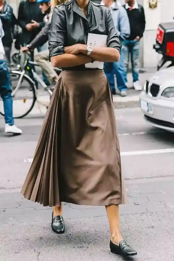 百褶裙Pleatedskirt:是指裙身由许多细密、垂直的皱褶构成的裙子。