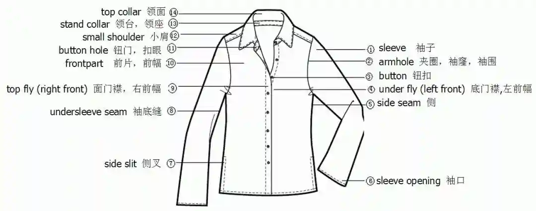 服装部位名称图解——衬衫