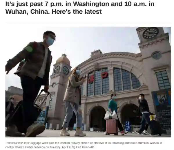 CNN称,长达76天的武汉“封城”今天正式结束。美国消费者新闻与商业频道(CNBC)表示,自1月23日起宣布“封城”以控制疫情以来,这座中国中部城市首次允许人们离汉。