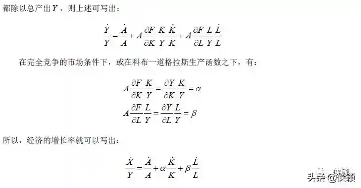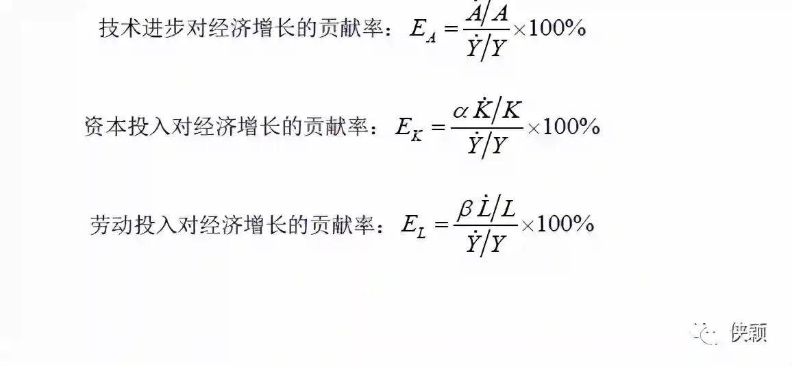 此式通常被称为经济增长核算方程,其中AA表明了国民经济生产中技术水平的提高速率,通常被称为技术进步率,而此经济增长核算方程则表明了国民经济的增长率分别由资本和劳动投入的增长率以及技术进步率共同决定。